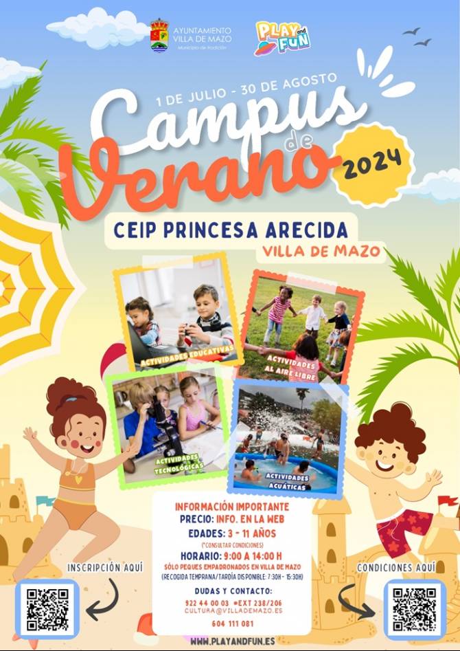 El Ayuntamiento de Villa de Mazo presenta el Campus de Verano CEIP Princesa Arecida 2024. En colaboración con la empresa Play and Fun, los niños residentes en el municipio entre los 3 y los 12 años podrán disfrutar de este campus, que tendrá lugar entre el 1 de julio y el 30 de agosto en horario de 9:00 a 14:00 horas.