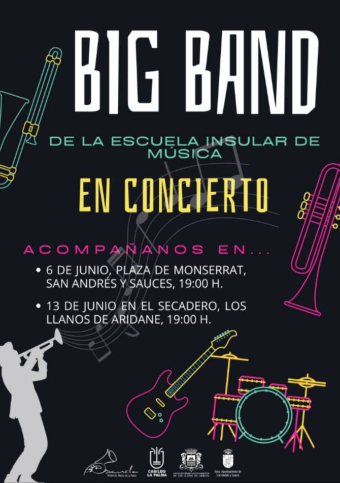 Big Band (6 junio en la plaza de Montserrat de los Sauces, y 13 junio, en el Secadero, los Llanos de Aridane) donde el conjunto interpretará un atractivo repertorio pasando por varios estilos jazzísticos como el swing, blues y fusión, entre otros característicos de esta formación. Y antes de partir a su viaje de intercambio con la escuela de Moaña (Galicia) donde se compartirán experiencias musicales y culturales entre los dos centros y conjuntos de similares características.