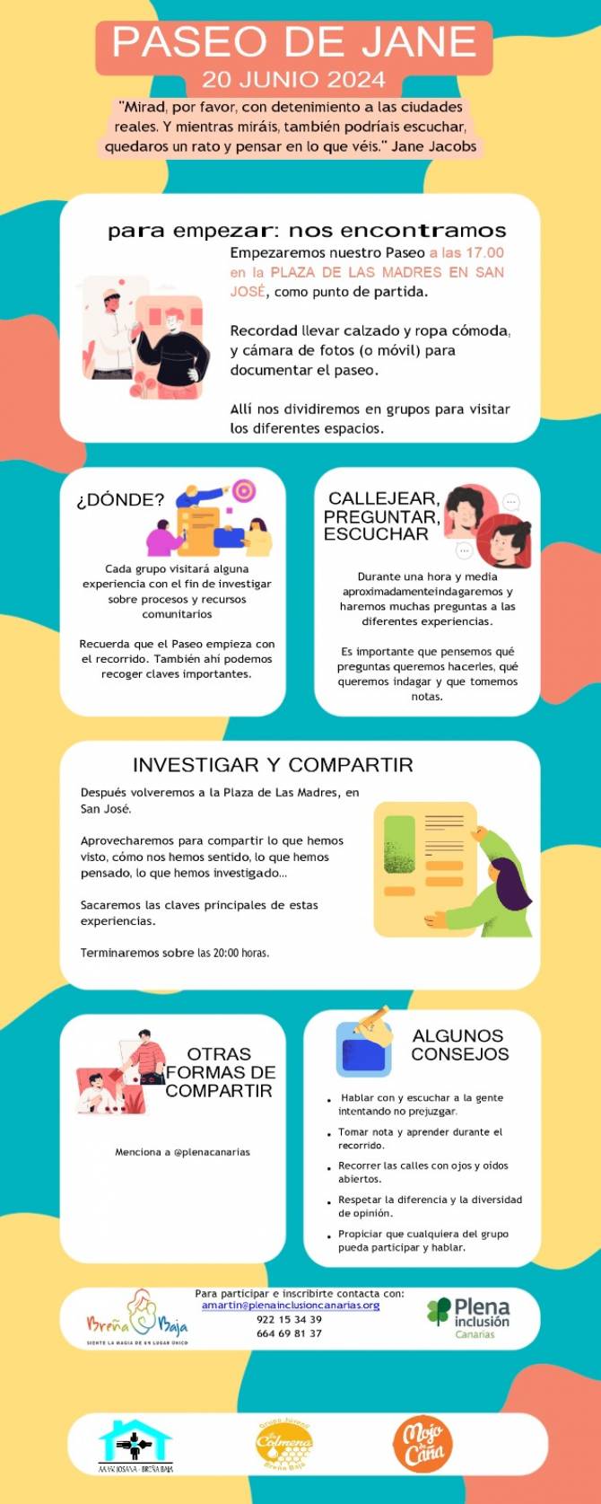 La Asociación Plena Inclusión Canarias invita a la población en general a un “Paseo de Jane” o paseo comunitario con la finalidad de conocer y encontrarnos con las diversas realidades y recursos del barrio de San José. La actividad tendrá lugar el jueves 20 de junio de 17 a 20 hs y el punto de partida será en la Plaza de Las Madres de San José.