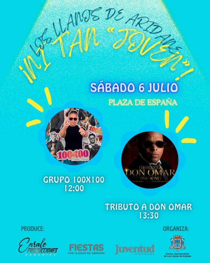 El Ayuntamiento de Los Llanos acogerá este sábado, 6 de julio, el festival ‘¡Ni tan joven!’. Desde las 12:00 horas la Plaza de España bailará al ritmo de la música del Grupo 100 x 100 para después disfrutar del Tributo a Don Omar.
