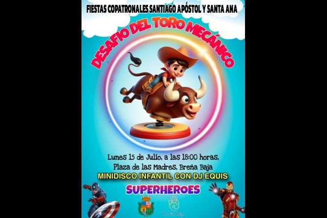 18:00 h. TARDE INFANTIL con el desafío del toro mecánico, Superhéroes y minidisco con DJ´S Equis.