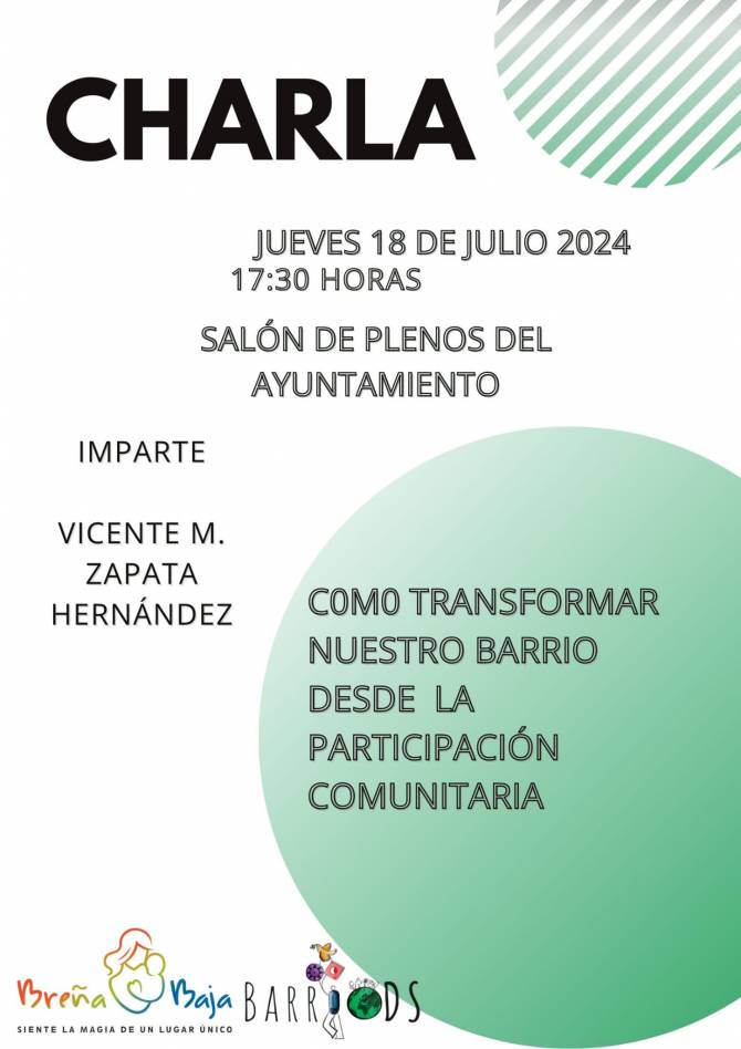 El jueves 18 de julio a las 17.30 hs tendrá lugar la charla sobre “Como transformar nuestro barrio desde la participación comunitaria: compartiendo la experiencia BarriODS” que imparte D. Vicente Manuel Zapata Hernández, profesor titular de Geografía Humana de la Universidad de La Laguna (ULL), en el salón de plenos del Ayuntamiento de Breña Baja.