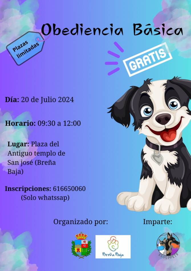 El sábado 20 de Julio en el Recinto Municipal de San José tendrá lugar un Curso sobre “Obediencia Básica” canina por parte del Club Snouppets y el Ayuntamiento de Breña Baja. Se lleva a cabo en horario de 9.30 a 12 hs, con motivo de las Fiestas Copatronales de Santiago Apóstol y Santa Ana 2024.