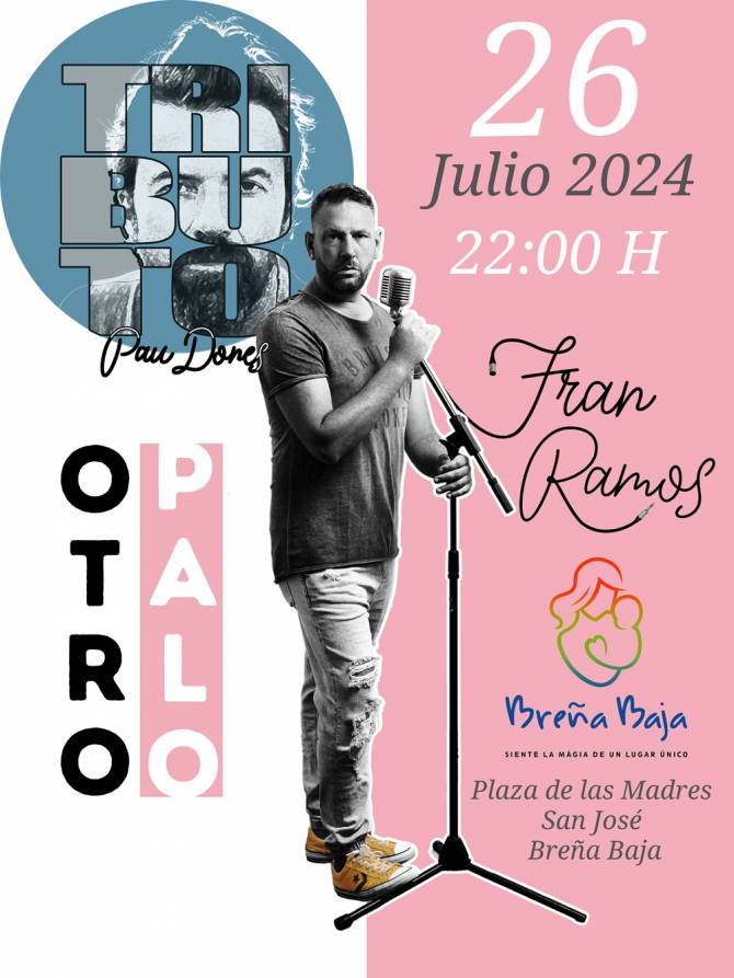 El viernes 26 de julio a las 22 hs, en la Plaza de Las Madres de San José, tendrá lugar el tributo de Pau Donés “Otro Palo” por parte de Fran Ramos. Organiza el Ayuntamiento de Breña Baja, que cierra con este concierto las Fiestas Copatronales de Santiago Apóstol y Santa Ana 2024. Entrada Libre.