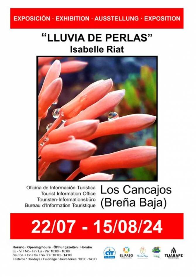Del 22 de julio al 15 de agosto la Oficina de Información Turística de Los Cancajos acoge la Exposición de fotografías "Lluvia de Perlas" de Isabelle Riat en los horarios de apertura de la oficina. Con la colaboración del Ayuntamiento de Breña Baja y el Cit Tedote.