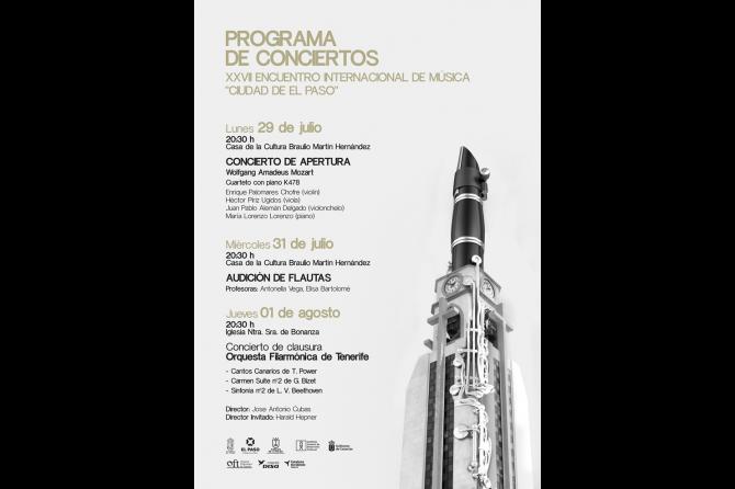 La programación del XXVII Encuentro Internacional de Música ‘Ciudad de El Paso’ comenzará el lunes, 29 de julio en la Casa de la cultura ‘Braulio Martín Hernández’, con un concierto de apertura que incluye el Cuarteto con piano K478 de Mozart interpretado por Enrique Palomares Chofre (violín), Héctor Piriz Ugidos (viola), Juan Pablo Alemán Delgado (violonchelo) y María Lorenzo Lorenzo (piano). El miércoles, 31 de julio, habrá una audición de flautas, en el mismo lugar, con las profesoras Antonella Vega y Elisa Bartolomé.