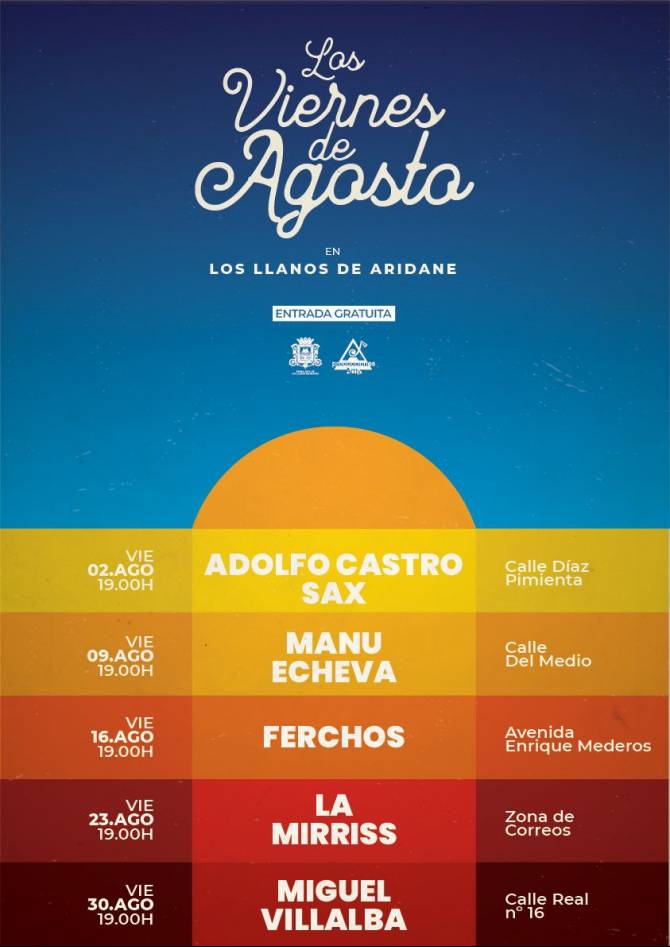 El Ayuntamiento de Los Llanos de Aridane organiza Viernes de Agosto, una iniciativa para dinamizar las zonas comerciales durante el verano con el mejor talento local durante todos los viernes del mes, a partir de las 19:00 horas. Artistas palmeros como Adolfo Castro Sax, Manu Echeva, Ferchos, La Mirriss y Miguel Villalva llenarán de música y alegría las calles del municipio.