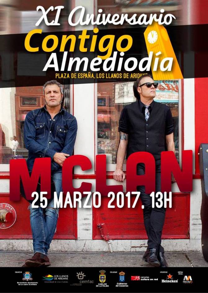 El proyecto 'Contigo Almediodía', que organiza el Ayuntamiento de Los Llanos de Aridane con la colaboración del Cabildo de La Palma y la Viceconsejería de Cultura y Deportes del Gobierno de Canarias, celebrará su undécimo aniversario el próximo sábado 25 de marzo con la actuación del grupo MClan.