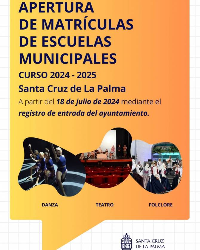 La concejalía de Cultura del Ayuntamiento de Santa Cruz de La Palma que coordina Alberto Perdomo ha abierto el plazo de inscripción para participar en las Escuelas Municipales de Teatro, Folclore y Danza durante el próximo curso 2024/2025.