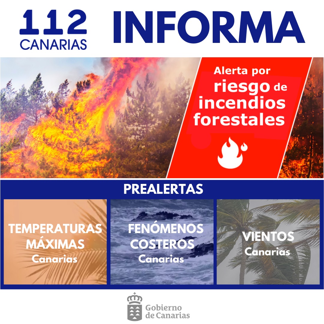 Asimismo, continúa activa la alerta por riesgo de incendio forestal en las islas occidentales y Gran Canaria, ante la persistente situación de peligro que existe en el archipiélago, motivada por unas temperaturas que siguen siendo elevadas y una importante sequía meteorológica.