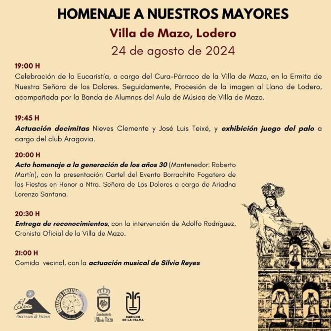 El Ayuntamiento de Villa de Mazo realizará un homenaje a los mayores del municipio el día 24 de agosto en Lodero. El evento, que pondrá en valor a la generación de los años 30, dará comienzo a las 19:00 horas con la celebración de la Eucaristía en la Ermita de Nuestra Señora de los Dolores.