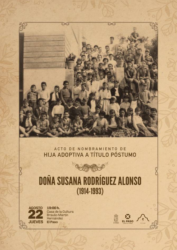 El Ayuntamiento de El Paso nombra a Susana Rodríguez Alonso (1914-1993) Hija Adoptiva del Municipio, a título póstumo. El acto de reconocimiento tendrá lugar el próximo jueves 22 de agosto, a las 19:00 horas, en la Casa de la Cultura Braulio Martín Hernández, en el marco de las Fiestas Trienales de la Bajada de la Virgen del Pino 2024.