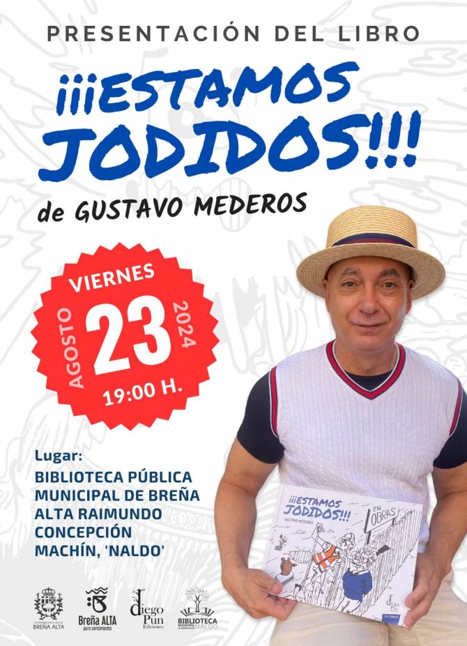 El municipio de Breña Alta será la sede para la presentación del libro ‘Estamos jodidos’, una elaboración del humorista gráfico breñusco Gustavo Mederos. El acto tendrá lugar este viernes, 23 de agosto, a partir de las 19:00 horas, en la Biblioteca Pública Municipal Raimundo Concepción Machín ‘Naldo’.
