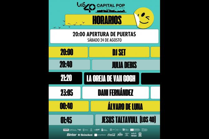 A las 21:20 la Oreja de Van Gogh deleitará a los presentes con su repertorio musical y a las 23:05 Dani Fernández nos regalará su talento y su voz, para ceder el turno a Álvaro de Luna. Le corresponde a Jesús Taltavull cerrar esta maravillosa noche que promete magia, alegría y mucho pop.