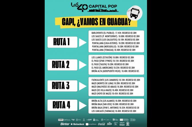 En todos los casos el regreso es a las 2:30 desde la parada del Recinto Portuario. Para acceder a los tickets y a más información puedes clicar en el siguiente enlace: https://lapalmashuttle.com/los-40-capital-pop/