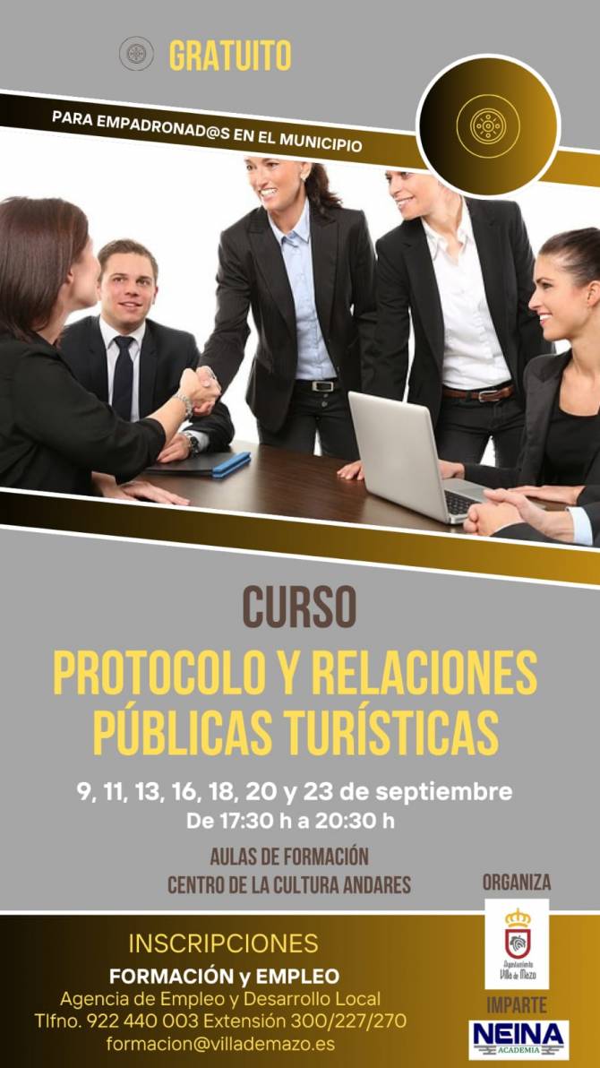 El Ayuntamiento de Villa de Mazo, a través de su Concejalía de Formación y Empleo, continúa con su firme compromiso de ofrecer formación gratuita a los vecinos y vecinas del municipio. En esta ocasión, se impartirá el curso Protocolo y Relaciones Públicas Turísticas, una iniciativa que busca dotar a los participantes de las habilidades necesarias para desempeñarse en el sector turístico, uno de los pilares fundamentales de la economía local.