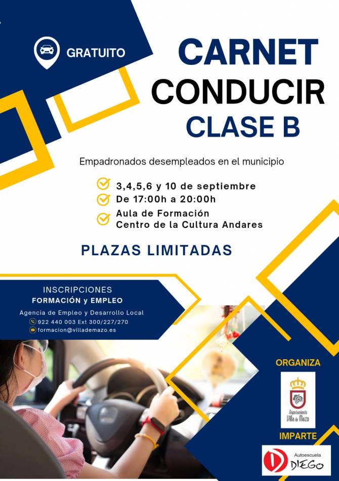 El Ayuntamiento de Villa de Mazo, a través de su Concejalía de Formación y Empleo, pone en marcha un curso gratuito de formación para la obtención del carnet de conducir clase B, dirigido a los vecinos desempleados empadronados en el municipio.
