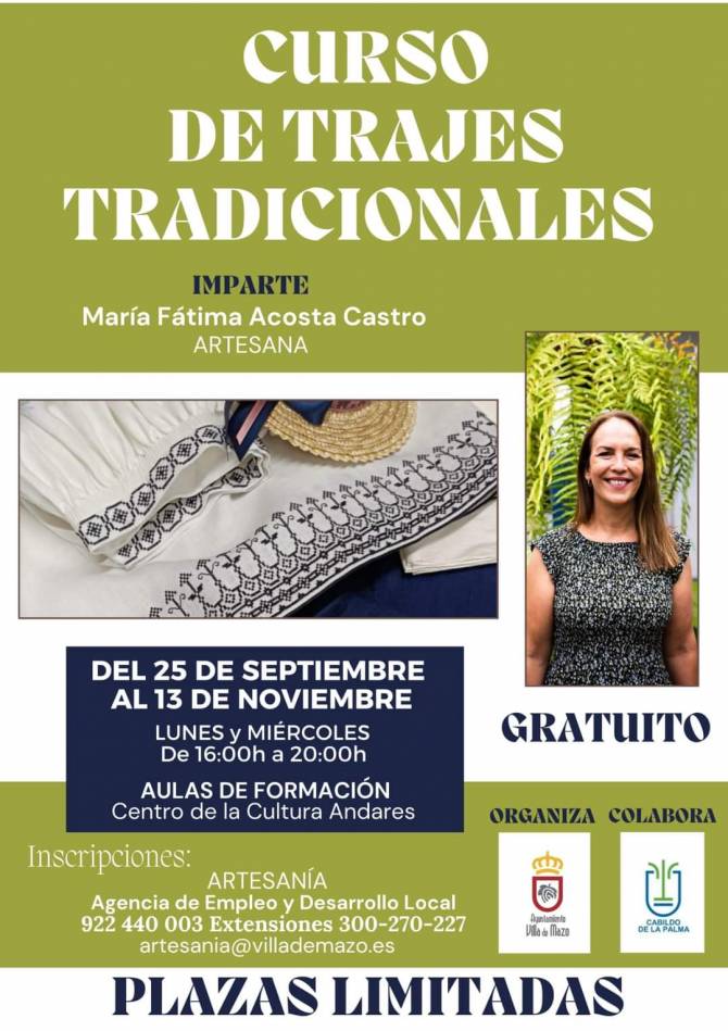 El Ayuntamiento de Villa de Mazo, a través de su Concejalía de Formación y Empleo, continúa con su programa de formación gratuita abierta a todas las personas interesadas en inscribirse. En esta ocasión, se ofrece un curso de trajes tradicionales que se llevará a cabo desde el 25 de septiembre hasta el 13 de noviembre, lunes y miércoles de 16:00 a 20:00 horas, en las Aulas de Formación del Centro de la Cultura Andares.