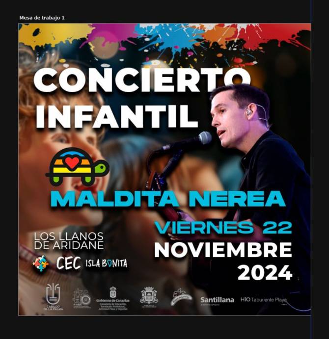 Esta fiesta infantil, de la mano de Maldita Nerea, llega gracias a la colaboración y el trabajo incansable del Ayuntamiento de Los Llanos de Aridane que, junto al Cabildo Insular de La Palma, organizador del Congreso y El Gobierno de Canarias como colaborador principal del mismo, hacen posible que suceda en La Palma algo casi inédito, un macro concierto dirigido exclusivamente al alumnado de entre 6 y 12 años y a sus docentes.
