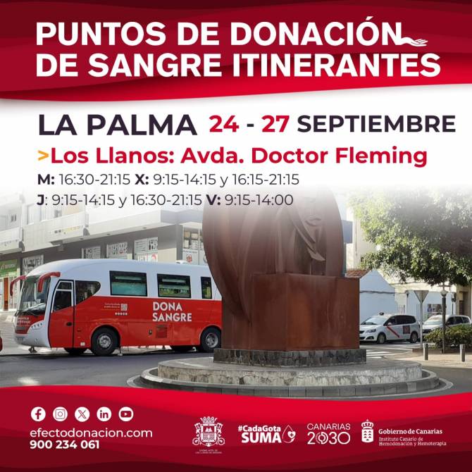 El Ayuntamiento de Los Llanos de Aridane informa que el Instituto Canario de Hemodonación y Hemoterapia (ICHH) instalará un punto itinerante de donación de sangre entre el martes, 24 de septiembre, y el viernes 27 de septiembre, en la avenida Doctor Fleming. El objetivo es facilitar la donación a la ciudadanía y reforzar las reservas de sangre en el archipiélago.