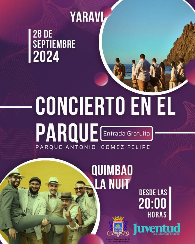 El Ayuntamiento de Los Llanos de Aridane, a través de la Concejalía de Juventud, celebra ‘Concierto en el parque’ el próximo sábado 28 de septiembre en el parque Antonio Gómez Felipe a las 20:00 horas. Los grupos, Quimbao La Nuit, y Yaraví formarán parte de las actuaciones musicales.
