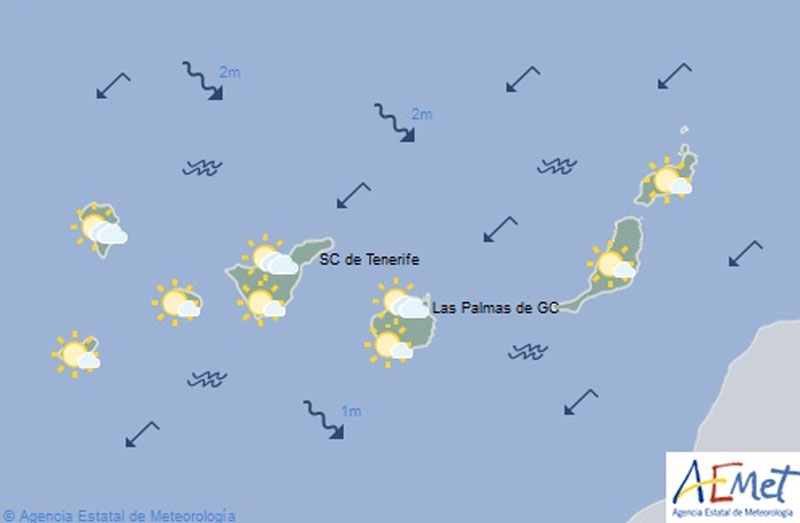 Las temperaturas sin cambios o en ligero ascenso de las máximas, afectando principalmente a medianías, y situándose entre los 22 y los 15 grados centígrados.