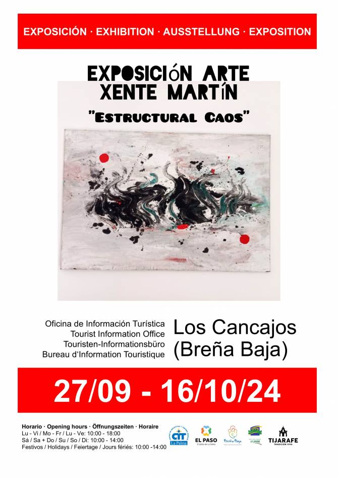 Del 27 de septiembre al 16 de octubre Xente Martín muestra la exposición de dibujo y pintura “Estructural Caos” en la Oficina de Turismo de Los Cancajos con los horarios de apertura de la oficina. Colabora Ayuntamiento de Breña Baja, CIT Tedote, entre otras entidades.