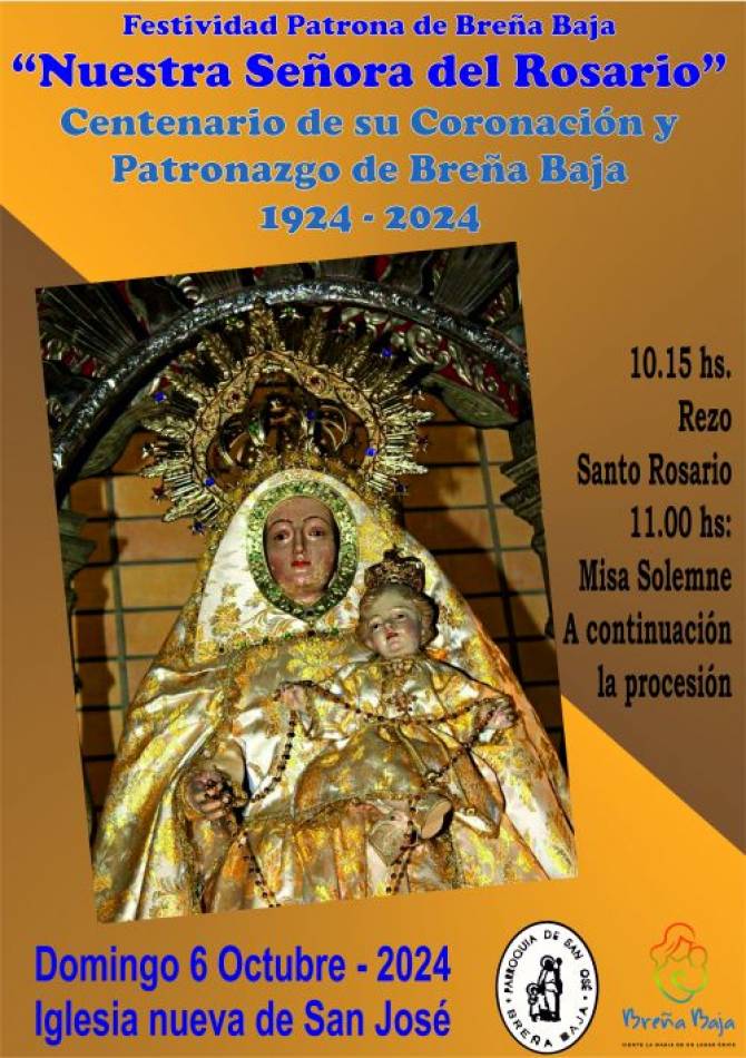 El domingo 6 de octubre tendrá lugar la celebración de la festividad de “Ntra. Sra. del Rosario”, patrona de la Villa de Breña Baja. Los actos religiosos tendrán lugar en la Iglesia nueva de San José con el rezo del Santo Rosario, 10.15 hs, y con la Misa Solemne cantada por el Grupo Musical “Gándara” de la tercera edad, a las 11 hs. A continuación Procesión por la Rambla de Los Poetas de San José.