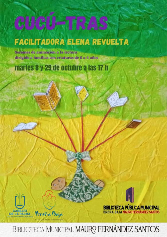 La Concejalía de Cultura del Ayuntamiento de Breña Baja sigue promocionando actividades en la Biblioteca Pública Municipal de Breña Baja "Mauro Fernández Santos" (San Antonio). Para el mes de octubre continua las sesiones de “Cucú-Tras” (0-4 años), para los días miércoles 8 y 29 a las 17 hs y facilitado y dinamizado por Elena Revuelta.