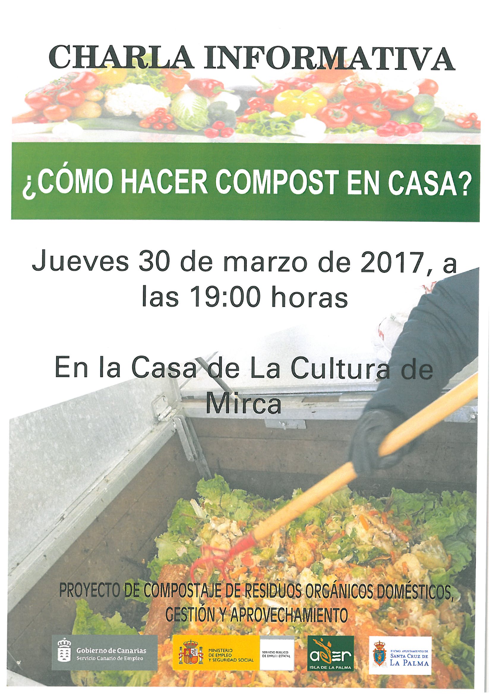 El Ayuntamiento de Santa Cruz de La Palma y ADER La Palma organizan una charla informativa sobre el uso del compost doméstico aplicado a la agricultura y a la jardinería que tendrá lugar este jueves, 30 de marzo, a las 19:00 horas en la Casa de la Cultura del barrio de Mirca. El técnico de ADER La Palma, Andrés Rodríguez Martín será el encargado de trasladar la información a los vecinos.