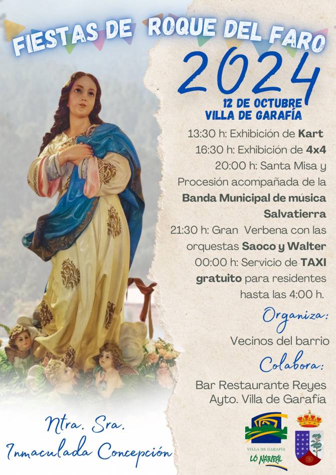El municipio de La Villa de Garafía se prepara para celebrar este sábado, 12 de octubre, las fiestas en honor a Nuestra Señora Inmaculada Concepción en el barrio de Roque del Faro. Esta festividad, que es una cita ineludible para los vecinos, comenzará a las 13:30 horas con una exhibición de Kart, seguida a las 16:30 horas de una exhibición de vehículos 4x4.