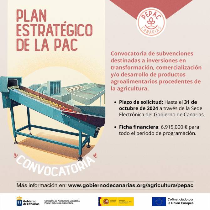 La Consejería de Agricultura, Ganadería, Pesca y Soberanía Alimentaria del Gobierno de Canarias abre de nuevo el plazo de presentación de solicitudes para acogerse a las subvenciones destinadas a inversiones en transformación, comercialización y/o desarrollo de productos agroalimentarios procedentes de la agricultura del Plan Estratégico de la Política Agrícola Común (PEPAC) 2023-2027.