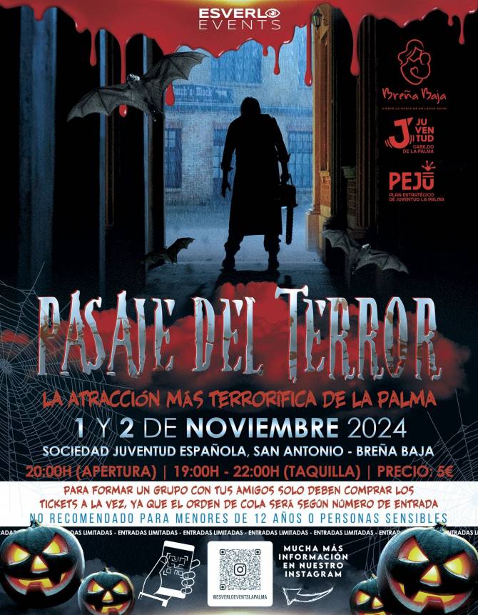 Llegado el fin de semana, tanto el viernes 1 como el sábado 2 de noviembre, la Sociedad Juventud Española de San Antonio abre sus puertas para presentar la octava edición del “Pasaje del Terror”, ya convertida en la atracción más terrorífica de La Palma durante Halloween y que ha cosechado un notable éxito de asistencia en las ediciones anteriores. El Pasaje del Terror está organizado por Esverlo Events conjuntamente con la Concejalía de Juventud del Ayuntamiento de Breña Baja y con la colaboración del Cabildo Insular de La Palma.