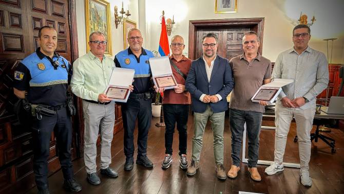 Acompañados por el Subinspector Jefe de la Policía Local de Santa Cruz de La Palma, Antonio Piñero, y el Oficial de la Policía Local de la capital palmera, Carlos Alberto Peña Ventura, hicieron entrega de una placa conmemorativa a Fernando Pérez Bethencourt, Juan Roberto Barroso Hernández y Tomás Hernández Hernández, en reconocimiento a su compromiso y labor pública en aras de velar por la seguridad de la ciudadanía durante sus más de treinta años de servicio.