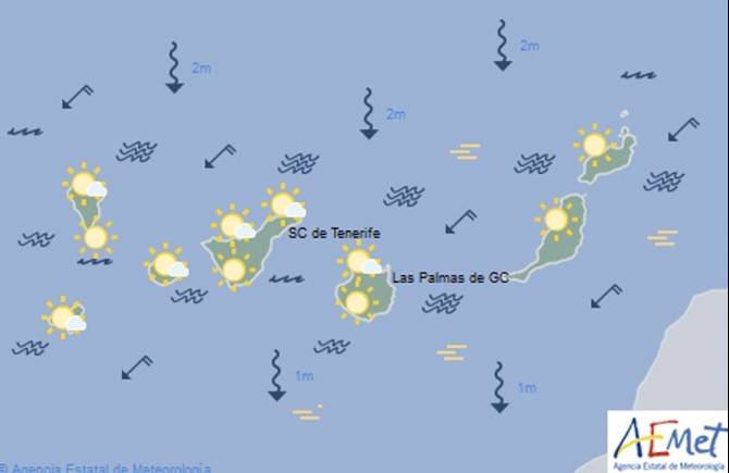 El viento soplará del Nordeste, entre unos 30 y 35 kilómetros por hora, algo más intenso en costas Noroeste y Sureste. Flojo variable con brisas en costa Suroeste. En zonas altas de componente sur flojo.