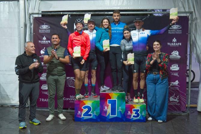 Pedro Rodríguez Mesa y Elena Cerdeña Rodríguez se coronan en la modalidad de 100 kilómetros de LA TEA MTB, en la que 250 ciclistas pedalearon este sábado, 16 de noviembre, por las pistas de la zona noroeste de La Palma, con salida y llegada en el municipio de Tijarafe. Manuel de León Hernández y Patricia García García subieron al segundo puesto del podio y Jacob Reyes Mesa e Isabel Castro Caraballo al tercero.