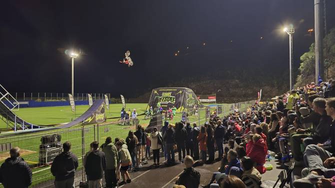 Villa de Mazo vibra con un espectáculo de freestyle de motos que llena el estadio municipal