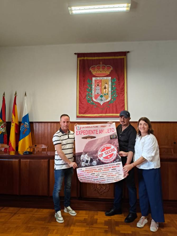 El Ayuntamiento de Tazacorte, a través del concejal de Cultura, Yordan Martín, y la concejala de Hacienda, Antonia Acosta, ha entregado este martes una medalla a Fran Rodríguez por el éxito de su cortometraje ‘Expediente Aniceto’, que se desarrolla en Tazacorte y fue presentado este mes en la Muestra Internacional de Cine Astronómico, celebrada en Santa Cruz de Tenerife.