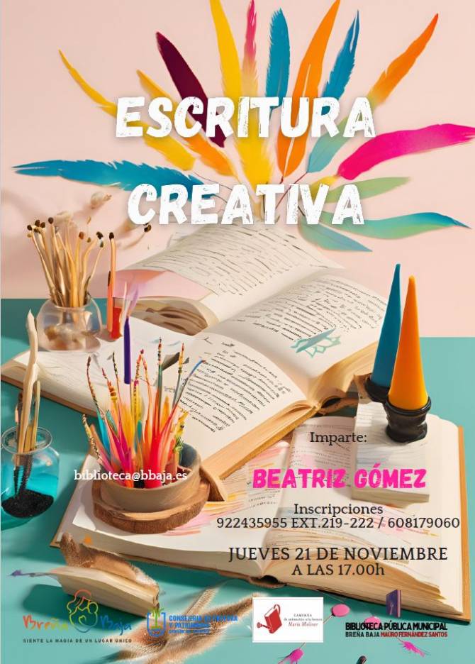 La Concejalía de Cultura del Ayuntamiento de Breña Baja sigue promocionando actividades en la Biblioteca Pública Municipal de Breña Baja "Mauro Fernández Santos" (San Antonio), para el mes de noviembre con el Taller de “Escritura Creativa” por parte de Beatriz Gómez.