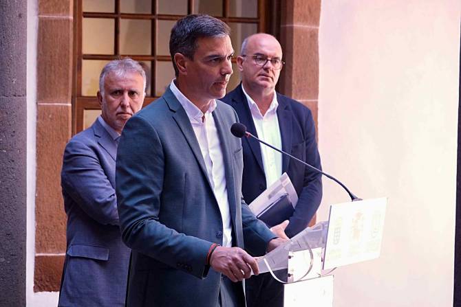 Pedro Sánchez señaló durante su comparecencia que "por mucho que insistan los desinformadores profesionales de este país, el Gobierno de España ha ejecutado o transferido el 99% de los 1.046 millones de euros en ayudas a inversiones que anunció en la isla de La Palma y que aquellas ayudas o indemnizaciones que aún no han llegado a las manos de sus legítimos perceptores no están en manos del Gobierno de España sino pendientes de ejecución por parte de otras administraciones".