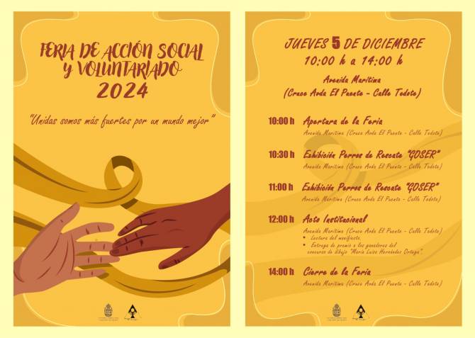 Santa Cruz de La Palma acoge este jueves, 5 de diciembre, la XXVI edición de la Feria de Acción Social y Voluntariado, con el fin de dar visibilidad al trabajo del tercer sector. Comenzará a partir de las 10:00 y hasta las 14:00 horas, y se desarrollará a lo largo de la Avenida Marítima y hasta el cruce con la calle Tedote.