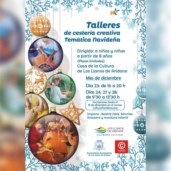 El 23 de diciembre se realizará en horario de 16:00 a 20:00 horas, mientras que los días 24, 27 y 28 de diciembre se desarrollarán en horario de 9:30 a 13:30 horas, también en la Casa de la Cultura. Este taller está dirigido a niños y niñas a partir de 8 años con el fin de enseñar técnicas tradicionales de cestería adaptadas a la Navidad.