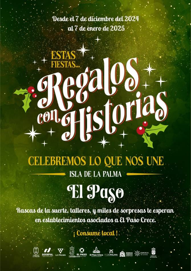 La Asociación de Empresarios El Paso Crece, en colaboración con el Cabildo Insular de La Palma, el Ayuntamiento de El Paso, Fedepalma, la Delegación en La Palma de la Cámara de Comercio de Santa Cruz de Tenerife y FAEP, pone en marcha la campaña navideña 'Regalos con Historia', una iniciativa dirigida a fortalecer en tejido comercial del municipio en estas fechas tan señaladas.