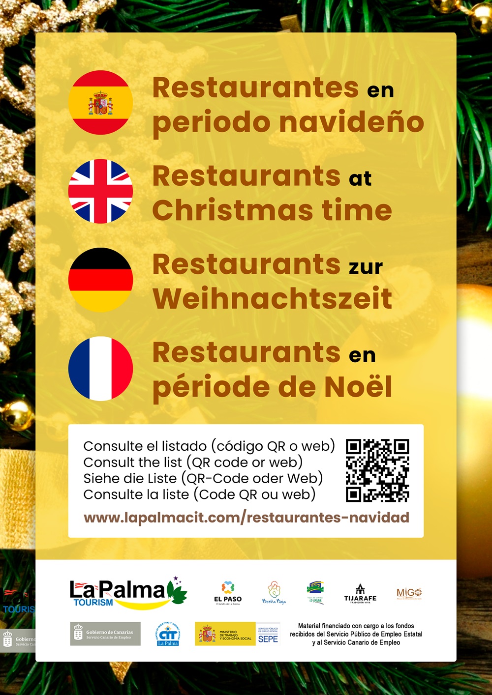 La guía de restaurantes está publicada en medios digitales hasta el próximo 6 de enero y disponible para su consulta en la web del CIT Insular ‘La Palma’ https://lapalmacit.com/restaurantesnavidad, así como en formato físico en cualquiera de las oficinas de información turística gestionadas por el CIT Insular ‘La Palma’, o bien a través de descarga de código QR en sus dispositivos móviles.