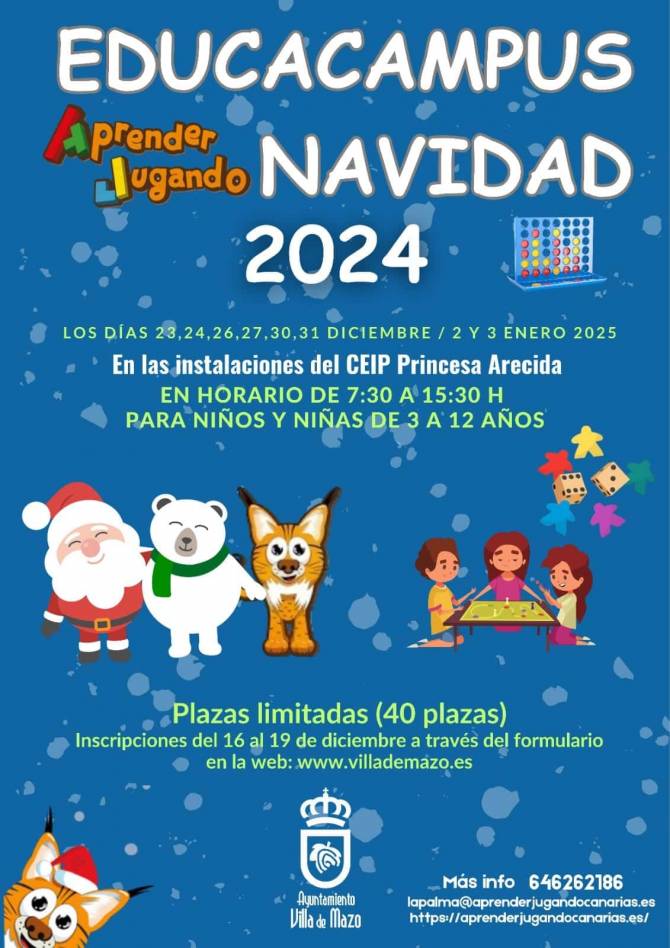 El Ayuntamiento de Villa de Mazo se prepara para celebrar una Navidad llena de diversión y aprendizaje con el Campus de Navidad 2024, que tendrá lugar los días 23, 24, 26, 27, 30 y 31 de diciembre de este año, así como el 2 y 3 de enero de 2025. Esta iniciativa está dirigida a niños y niñas de 3 a 12 años empadronados en el municipio, ofreciendo un espacio educativo y de entretenimiento durante las vacaciones escolares.