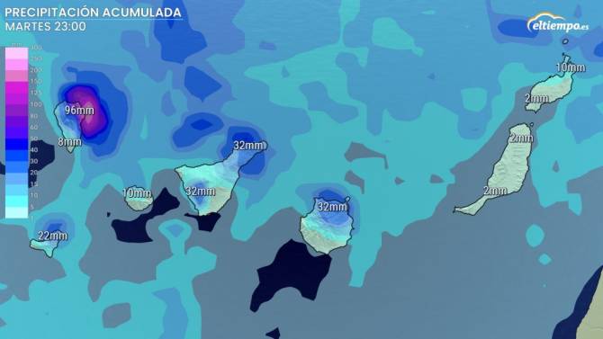 Los acumulados que puede dejar esta DANA en Canarias serán más significativos al norte de las islas y pueden destacar en el noreste de La Palma, con previsión de casi 100 mm hasta el martes. En el norte de Tenerife y Gran Canaria, pueden sumar más de 30 mm.