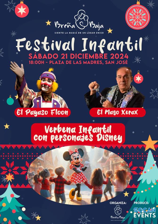 El sábado 21 de diciembre a las 18 hs en la Plaza de Las Madres de San José, tendrá lugar el “Festival Infantil” en el marco del programa de Navidad del municipio. Organiza el Ayuntamiento de Breña Baja. Produce Socan Events. Entrada Libre.