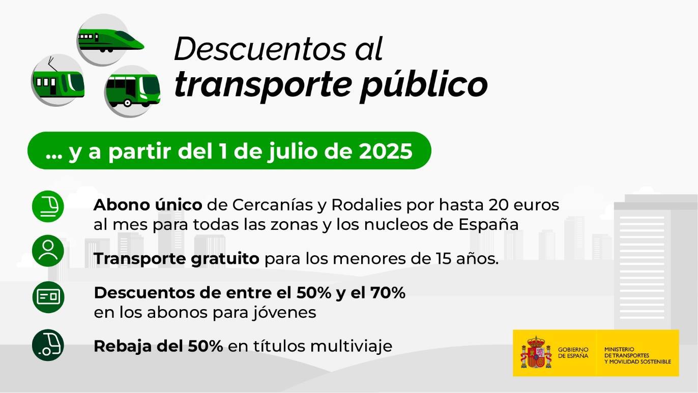El Gobierno ha prorrogado hasta el 30 de junio de 2025 los descuentos de hasta el 100% del transporte público terrestre para viajeros habituales. Así, los abonos gratuitos de Cercanías, Rodalies, Media Distancia convencional y de las líneas de autobús estatal se mantienen vigentes durante el primer semestre de 2025, así como las ayudas directas a las comunidades autónomas y entidades locales para promover la reducción de, al menos, el 50% del precio de los abonos y títulos multiviaje del transporte público colectivo urbano y metropolitano.