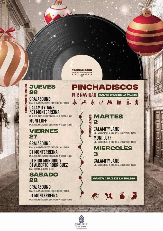 Así, desde este jueves y hasta el 5 de enero de 2025, la concejalía de Desarrollo Local ha programado varias sesiones a cargo de distintos artistas del panorama actual que cuentan con una gran aceptación entre el público y que ofrecerán sus mejores repertorios en vinilo en emplazamientos como la placeta de Borrero, la "Acera Ancha" y la explanada situada frente a la Farmacia Alameda y la calle Santa Catalina.Así, los días 26, 27 y 28 de diciembre, además del 2 y 3 de enero, rotarán por estos puntos en diferentes horarios de tarde, pinchadiscos como Graja Sound, Monterreina, Calamity Jane, Moni Loff y los djs Higo Mordido y Alberto Rodríguez.