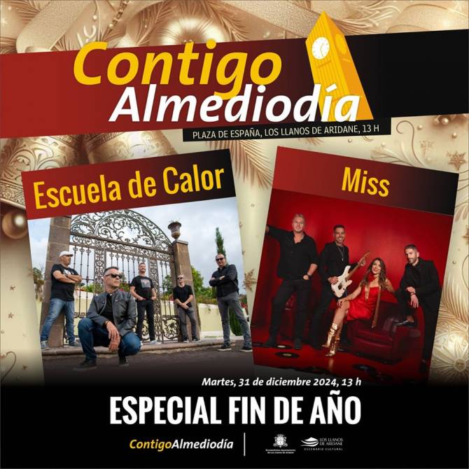 El Ayuntamiento de Los Llanos de Aridane celebrará una edición especial de Contigo Almediodía para despedir el año con los conciertos de Miss y Escuela de Calor. Estos tendrán lugar el próximo 31 de diciembre, a partir de las 13:00 horas, en la Plaza de España, coincidiendo con los eventos programados para fin de año.